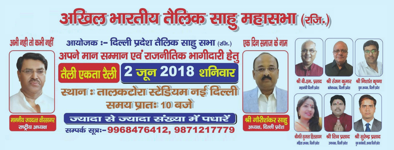 Delhi pradesh Tailik Sahu Sabha has been constituted by the Teli community migrated from their parent state like Bihar, UP, Rajasthan, MP and settled in Delhi NCR.